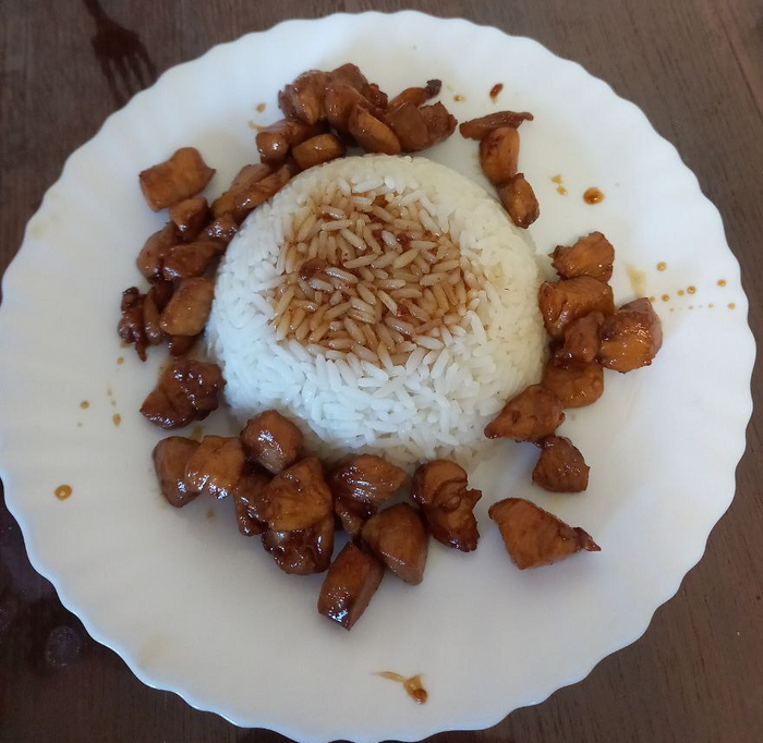 Дети на завтрак заказали курицу в карамели. Ставим воду на рис, пока она закипает нарезаю куриную грудинку (что вчера была срезано с куриного скелета) добавляю черного соевого соуса, чеснока и соли. Как вода закипела закидываю пропаренный рис (я его варю как макароны) ставлю вок на максимум, немного растительного масле, кидаю туда грудинку и быстро-быстро мешаю. Жарю буквально минуту. Грудинка поменяла цвет - отбрасываю ее на железный дуршлаг. В вок насыпаю сахар и грею его пока не растает. Закидываю грудинку в вок и быстро мешаю. Буквально минуту - грудинка опять меняет цвет. Становится красно-коричневой. Вываливаю все на дуршлаг (сам дуршлаг ставлю на чистую тарелку чтобы излишки карамели стекли в тарелку). Как раз к этому времени готов рис. Соус что стек идет как подливка на рис. На все про все минут 30.
