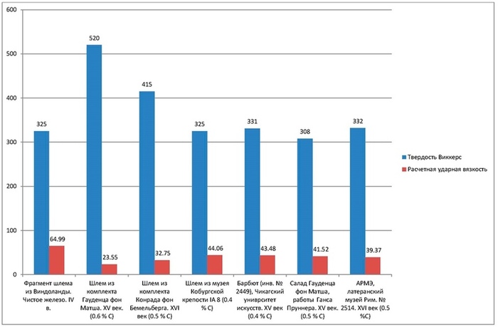 Распространённым мотивом у древних авторов является «мягкость» наконечника пилума и тут мы можем ответить со всей уверенностью – так и было. Металлографические исследования находок наконечников пилумов клада из града Смихель демонстрируют мягкую железную часть и стальной наконечник [17]. Что интересно, наконечник был также сварен с более мягким сердечником, как делались мечи в то время. Микротвердость составляет 90-110 по Виккерсу и соответствует достаточно посредственным копьям, что в принципе понятно, поскольку одной из целей оружейников было сделать так, чтобы пилум не прилетел обратно.