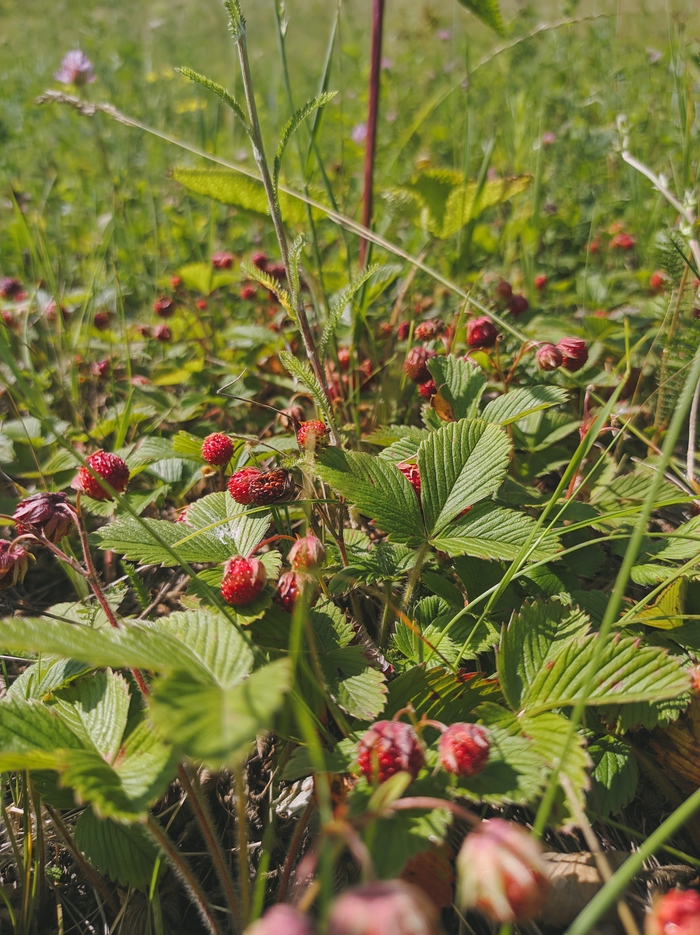 По пути до следующего водопада наткнулись на медвежьи следы и огромные солнечные склоны усеянные земляникой, грех было не остановиться