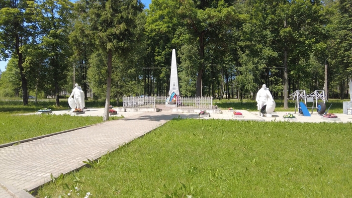 В противоположном углу сквера находится монумент с вечным огнем в честь воинских частей освободивших город Дно в феврале 1944 года
