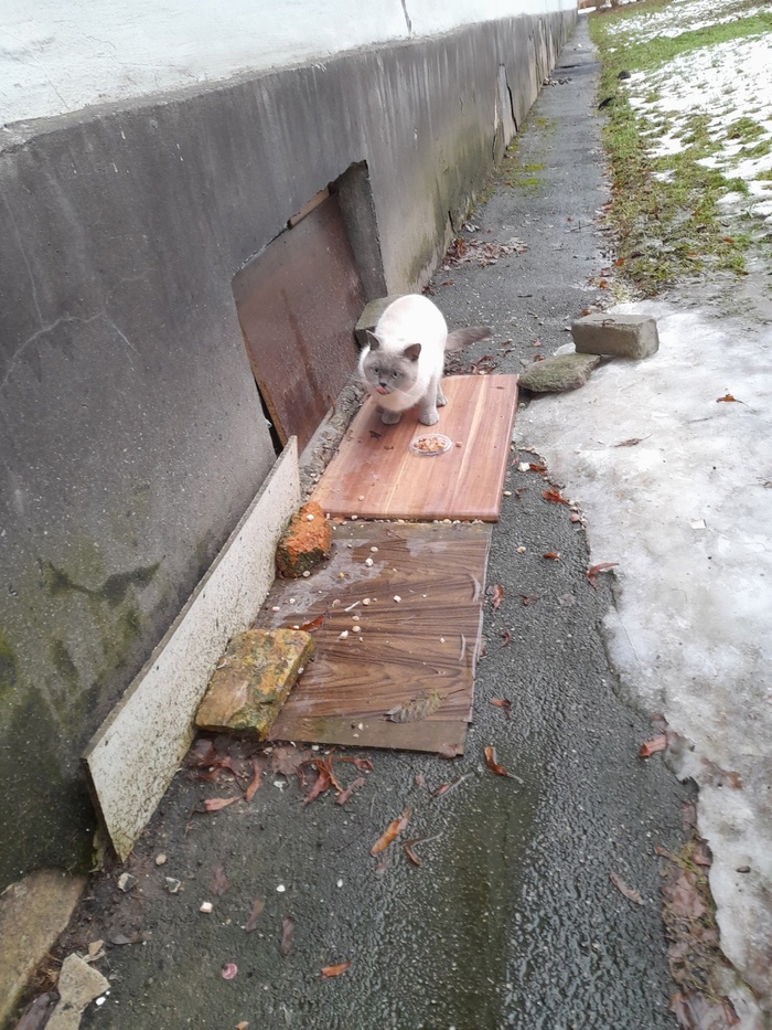 Кормлю брошенных дачниками кошек 26 декабря. Минус 16. Двое новеньких, забранных с мороза (голубой котенок и крошка-трехцветка)