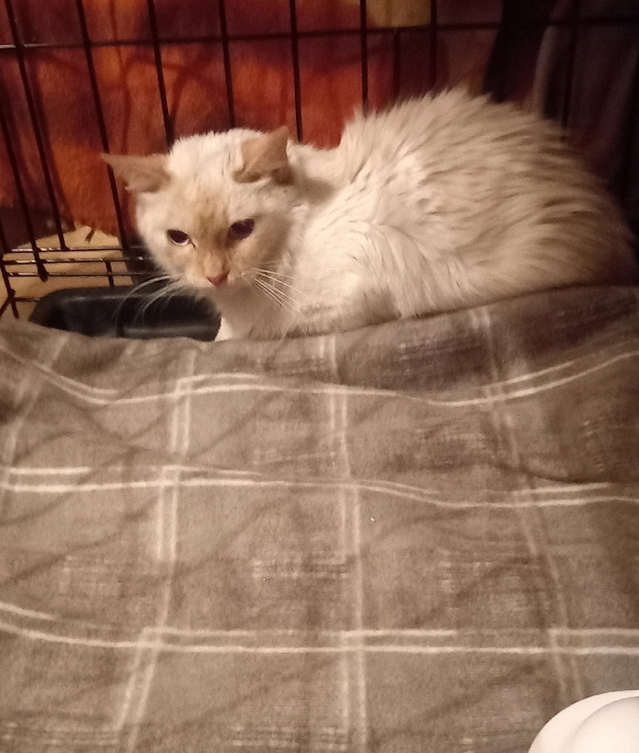 Вчера поздно вечером мы поймали кошку из заброшенного садоводства. Голова на бок, ухо сильно течёт, заваливается