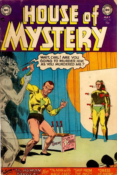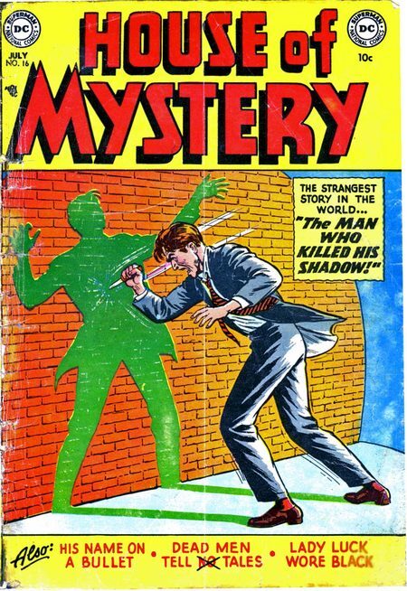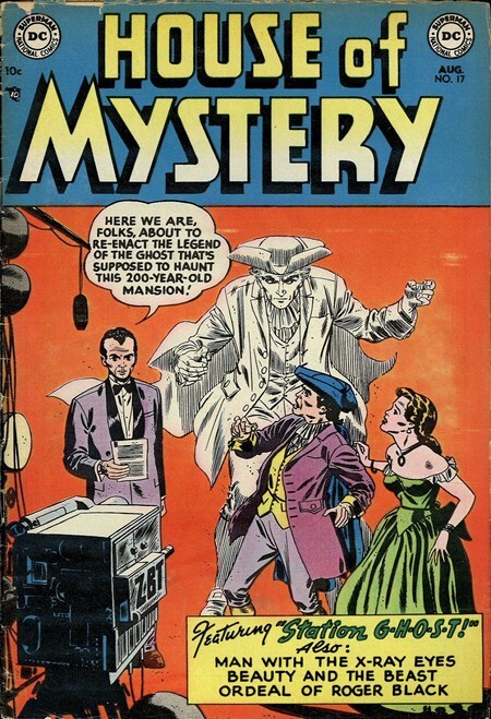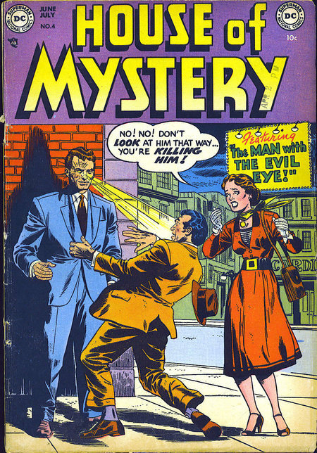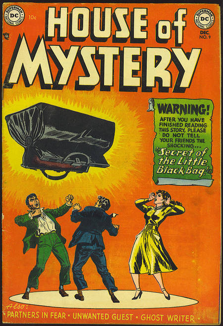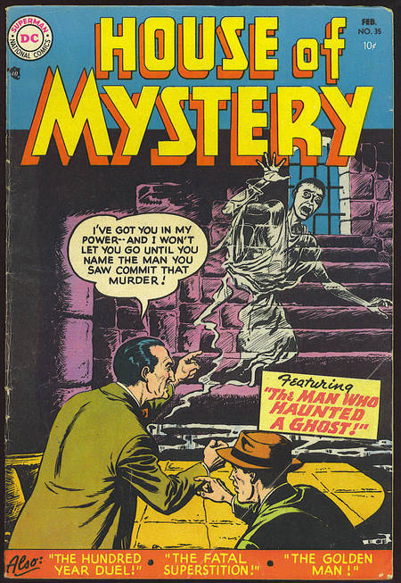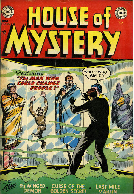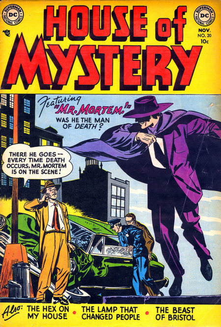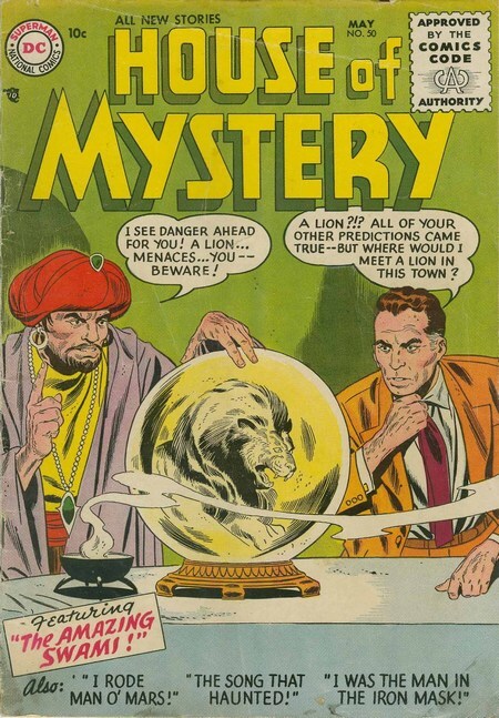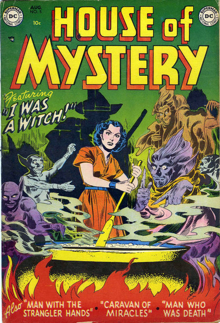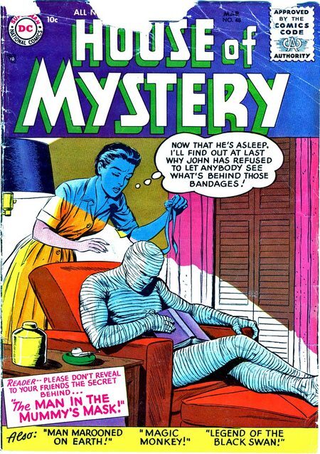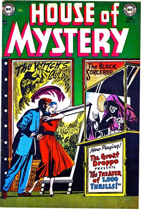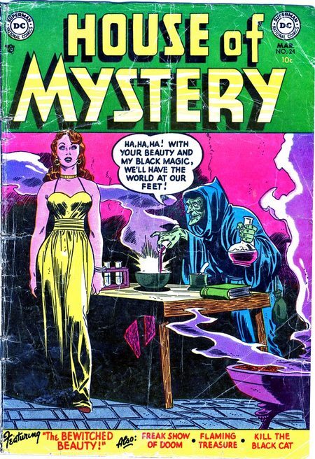 Так что двери Дома Тайн открываются в комиксе House of Mystery #1 за январь 1951 года, с историями и рисунками от Курта Суонна, Боба Брауна и Берни Кригштейна. Поскольку историй много, придётся либо описывать все вкратце, либо выбирать лучшее, оставляя проходняк за кадром...как получится. Первая история называется “Я влюбился в ведьму”. Картер Блейк, частный детектив, гордится тем, что ни одной девушке не удавалось его очаровать... и внезапно влюбляется и за считанные дни готовится жениться. Но профдеформация заставляет его раскопать прошлое невесты, и узнаёт Картер (от знакомого, Бориса Уайлдера), что предыдущие три мужа его возлюбленной таинственно умерли на следующий день после свадьбы! Картер не решается на свадьбу – но в итоге осмеливается, и начинаются таинственные покушения на его жизнь. Каким-то чудом ему удаётся каждый раз не погибнуть, в последний раз его спасает сама жена. Оказывается, все покушения подстраивал Борис Уайлдер, стремясь устранить детектива, чтобы тот не вскрыл его собственные тёмные делишки. Уайлдера казнят на электрическом стуле. а Картер живёт счастливо с молодой и красивой женой, которая вовсе и не ведьма.
