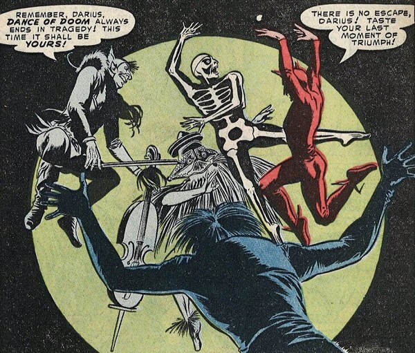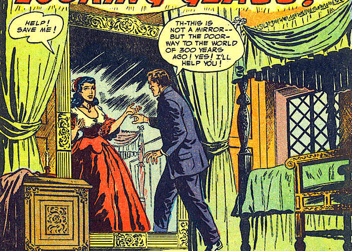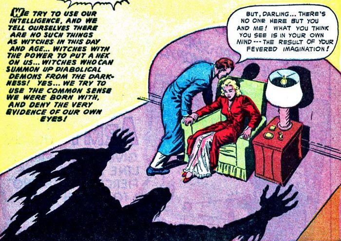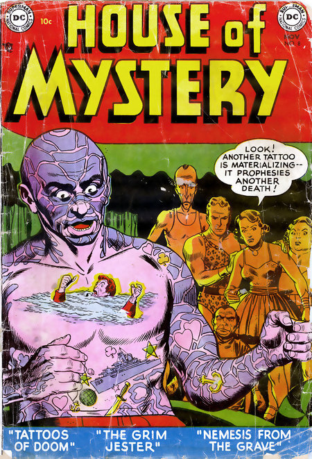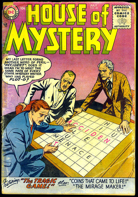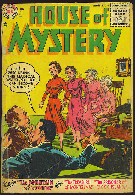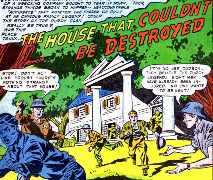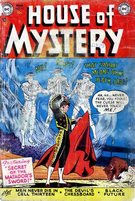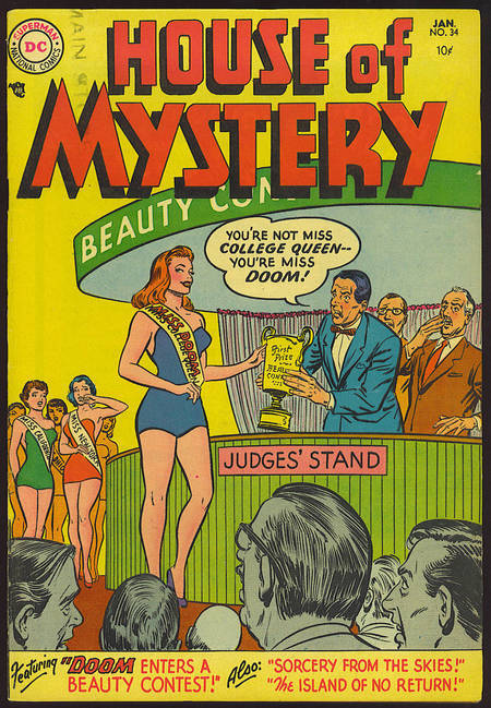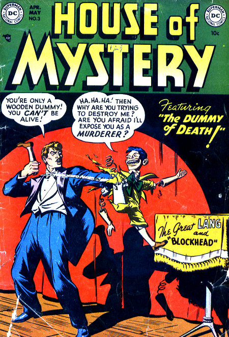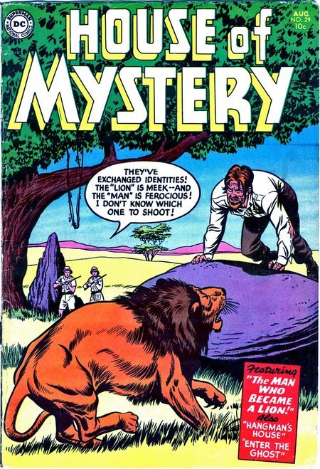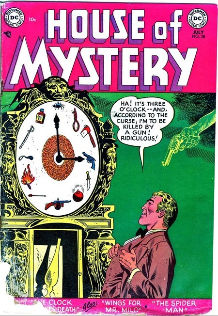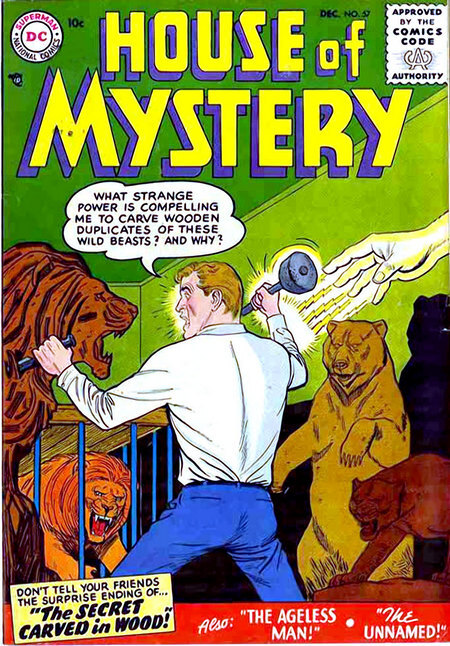 Так что двери Дома Тайн открываются в комиксе House of Mystery #1 за январь 1951 года, с историями и рисунками от Курта Суонна, Боба Брауна и Берни Кригштейна. Поскольку историй много, придётся либо описывать все вкратце, либо выбирать лучшее, оставляя проходняк за кадром...как получится. Первая история называется “Я влюбился в ведьму”. Картер Блейк, частный детектив, гордится тем, что ни одной девушке не удавалось его очаровать... и внезапно влюбляется и за считанные дни готовится жениться. Но профдеформация заставляет его раскопать прошлое невесты, и узнаёт Картер (от знакомого, Бориса Уайлдера), что предыдущие три мужа его возлюбленной таинственно умерли на следующий день после свадьбы! Картер не решается на свадьбу – но в итоге осмеливается, и начинаются таинственные покушения на его жизнь. Каким-то чудом ему удаётся каждый раз не погибнуть, в последний раз его спасает сама жена. Оказывается, все покушения подстраивал Борис Уайлдер, стремясь устранить детектива, чтобы тот не вскрыл его собственные тёмные делишки. Уайлдера казнят на электрическом стуле. а Картер живёт счастливо с молодой и красивой женой, которая вовсе и не ведьма.
