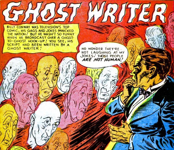 Жил да был стэндапер, и был у него “ручной” писатель, который писал все его шутки, но сам комик утверждал, что сам их пишет. Однажды писателю это надоело и он потребовал признания, а получив отказ, собрался поведать газетам о том, что знаменитый комик пишет свои шутки не сам. Но комик разозлился и писателя убил. И его начали преследовать кошмары – призрачные лица, смеющиеся рты и руки из ниоткуда. Впав в отчаяние, комик признаётся, что убил своего писателя. И тут призрачные лица снимают призрачные маски, а под ними оказываются вполне живые актёры, с которыми комик должен был репетировать следующую комедию по недочитанному им сценарию убитого писателя. И такие “Погоди, в смысле ты его убил?!”. И сдают комика полиции.