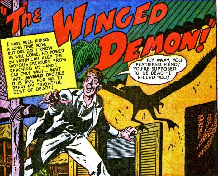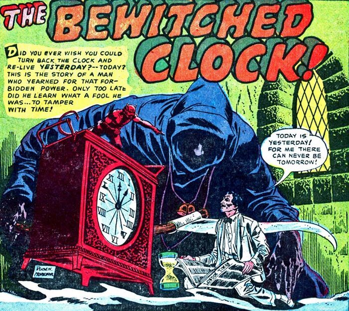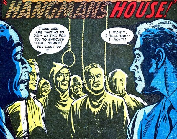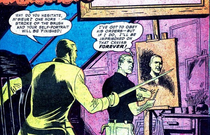 А впереди комикс House of Mystery #7 за октябрь 1952 года. Выведенная на обложку история повествует об Алджере Денхэме. Был он задохликом и рукожопом, но внезапно в нём открылась недюжинная сила, талант художника и умение метко стрелять. Как так? Алджер утверждает, что использоват тёмную магию, чтобы похитить таланты своих покойных предков – силу дяди, художественный талант деда, меткость прадеда и т.д. Сам Алджер уже и не рад – он не может сказать заклинанию “Горшочек не вари”, и опасается, что рано или поздно ему достанутся таланты какого-нибудь злодея (всякие гады в роду могли быть). В его галерее висят девять портретов, и один завешен тканью, и Алджер отказывается его открывать. Но вскоре он убивает дядю, якобы под влиянием последнего, девятого родственника, жуткого убийцы, жившего в 18 веке. Или нет? Разумеется, вся история с тёмной магией – обман. Алджер всё подстроил, заставив людей поверить в свои таланты, которых нет (сила сымитирована поднятием пластмассового ящика, покрашенного под металл, меткость – тоже обман в тире, и картину написал не он). Он провернул всё это, чтобы убить дядю и остаться безнаказанным. Но прокололся на деталях, так что Элджера сажают в тюрьму.