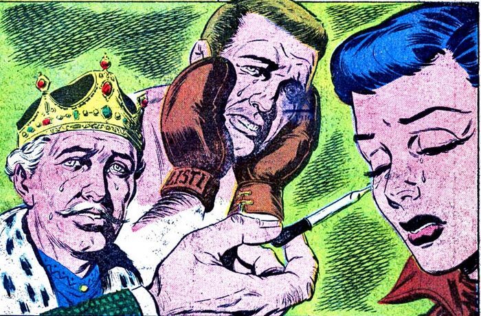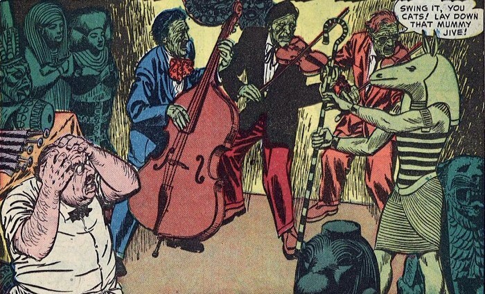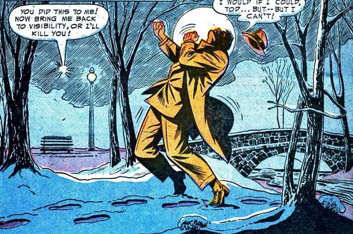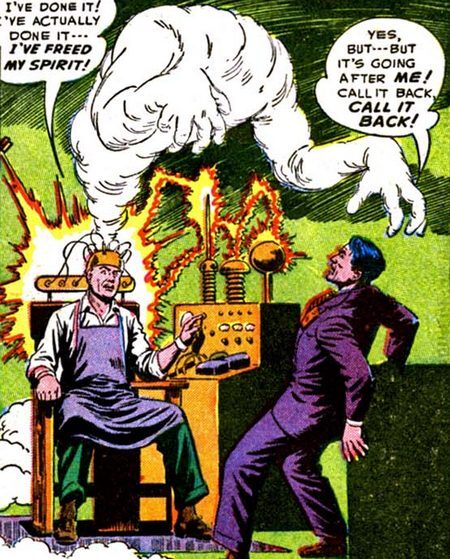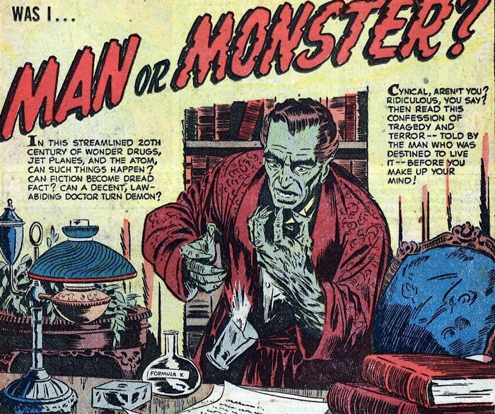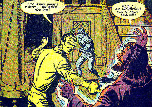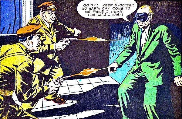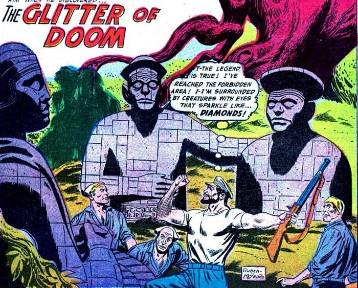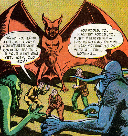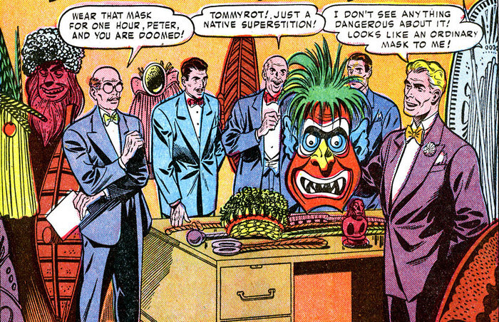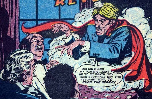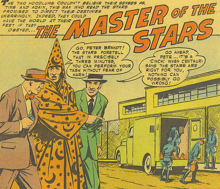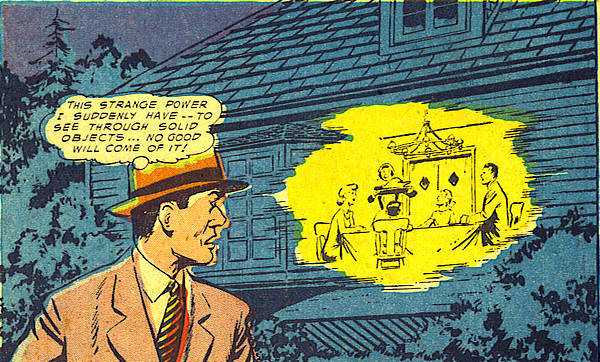Что поделаешь – пусть до принятия Кодекса Комиксов ещё пара лет есть, и пусть это и “Дом Тайн”, насаждать настоящую мистику настоятельно не рекомендуется, ибо дети должны верить только в Бога и науку. Так что го к комиксу House of Mystery #4 за июль 1952 года – авось, тут найдётся что-нибудь, действительно таинственное. Первая история повествует о “Человеке со злым глазом”. Жил да был бандит, и однажды ослеп, когда у него перед лицом взорвался пистолет. Пошёл он по больницам, чтобы его записали на пересадку глаз, но везде получил отказ. И поехала у него крыша – отныне он злые глаза везде видел и шёпот их слышал. А как только правое око удалось пересадить, со встречными несчастные случаи начали происходить. Доставшийся от другого бандита правый глаз наводил на врагов смертельный сглаз! Так, ладно, чот понесло меня. В общем, пошли слухи о бандите-злобоглазе, чей взгляд убивает. Бандита перестали пускать в приличные заведения и его безумие вернулось, он вновь начал видеть везде шепчущие злые глаза и сходить с ума, и отправился к доктору. “Эй, Склифосовский! Я убил мужика ради этого глаза, а ты превратил мою жизнь в ад!”. И-и-и бандита вяжет полиция – вся хохма с безумием и злым глазом оказывается подставой и планом получения признания, а “жертвы” злого глаза – подставными лицами, которые реалистично сфабриковали свои смерти. Что ж, фокусы – ложь, взрослые знают умы...