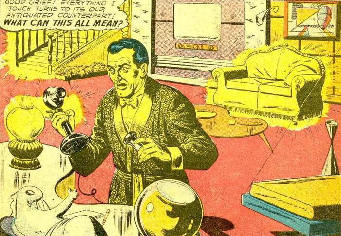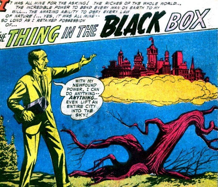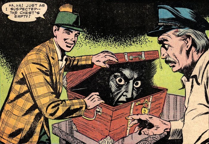На полном серьёзе предлагаю перейти к комиксу House of Mystery #9 и “Тайне маленькой чёрной сумки”. Жил да был безработный Энди, и был у него друг-парикмахер Луи. И ВНЕЗАПНО безработный “поднялся”, приобрёл дорогую тачку, стал вести себя заносчиво, прислугу унижать, нос задирать. И он везде носил с собой небольшой чёрный саквояжик, и утверждал, что в нём тайна его успеха. Луи стал одержим идеей эту тайну выведать. Луи даже договаривается с вором, чтобы тот украл саквояжик. Вор же думает, что в саквояжике деньги или самоцветы, и решает открыть и посмотреть – и внезапно начинает полыхать от ярости и пытается убить парикмахера, после чего падает замертво. Энди сам заглядывает в саквояжик – а там только металлическая пластинка, половинка формы для печати фальшивых денег, и записка: “Если ты это читаешь, значит, ты открыл мой саквояжик и тебя кольнула потайная отравленная иголка, тебе осталось жить две минуты”. Ну, понятно, почему погиб вор. Луи докладывает о находке полиции, и Энди сажают в тюрьму. Луи, как его друг, делает ему последнюю стрижку – Энди ждёт электрический стул.