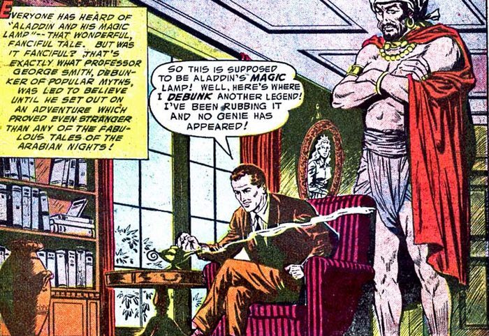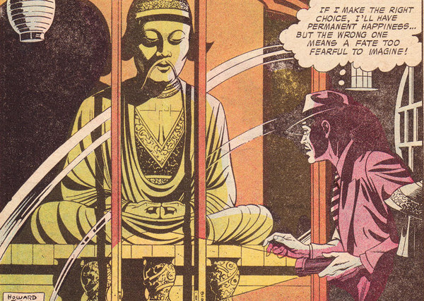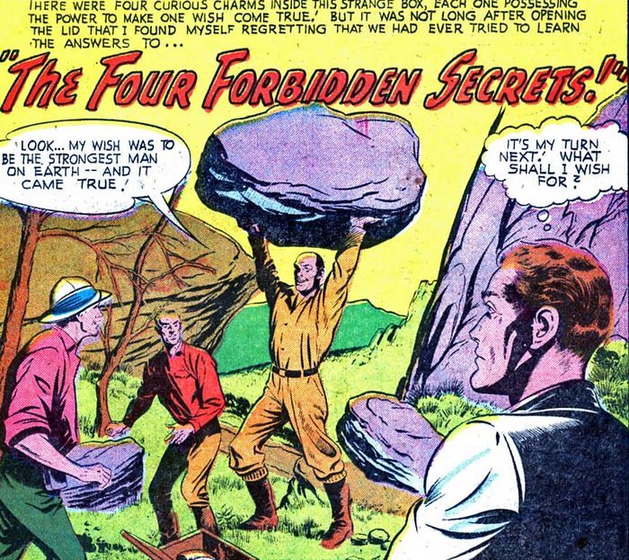 Но на сегодня тайн достаточно – остановиться пока что предлагаю на комиксе House of Mystery #10 за январь 1953 года, от Курта Суонна, Джима Муни, Боба Брауна и Леонарда Старра. Убийца, который не может отделаться от воспоминаний об убитом человеке, решает отвлечься и покупает бюст Шаньду, на котором написано – “Я выполню твоё самое сокровенное желание, но ценой станет проклятие”. Убийца желает, чтобы убитый им человек был жив – и тот оживает... и убивает самого убийцу! Бюст переходит из рук в руки. Некрасивая девушка желает стать красавицей, чтобы в неё влюбился парень, который ей нравится. Она становится красавицей, но парню она втайне нравилась, ещё пока была некрасивой, а теперь парень думает, что она ведьма, а богобоязненному американцу с ведьмами не по пути. Девушка со злости выбрасывает бюст, его находит богач и хочет стать первым человеком на Луне. И его записывают в космическую программу. Но путешествие оказывается в один конец – ракета не рассчитана на повторный взлёт с Луны. И бюст достаётся мужчине, который в детстве попал под машину, так как играл на проезжей части, потому что играть было негде. И он желает, чтобы в городе было много игровых площадок для детей. И их становится много, а на бюсте становится видна ранее скрытая вторая часть надписи-предупреждения: “...но если это пожелание на благо человечеству, проклятия не будет”.