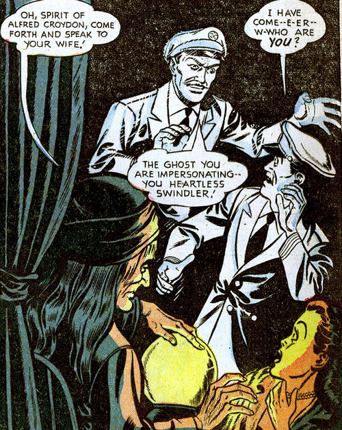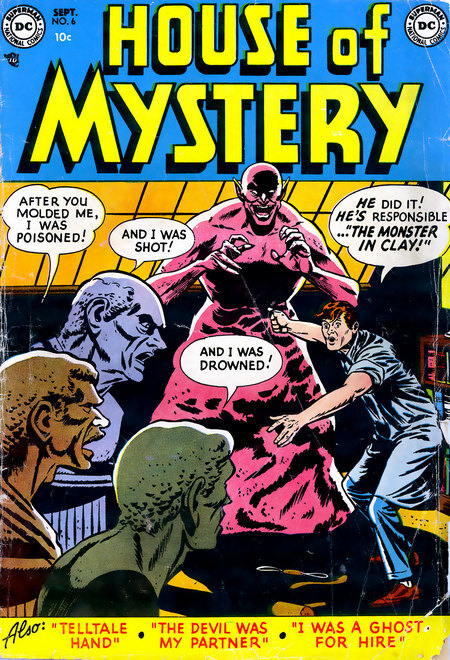 Оставив эту тайну в покое, пора перейти к комиксу House of Mystery #6. Жил да был скульптор, и однажды он пошёл против неписаных правил скульпторов и вылепил бюст чернокнижника, которого запрещено было изображать. И-и-и начал сходить с ума. Кошмары заставляли его делать изваяния знакомых, и эти знакомые вскоре погибали. Чуя неладное, скульптор лепит бюст одного клиента, который к нему зачастил, и изображает его с прутом в башке. Клиента это пугает и он сознаётся, что гипнотизировал скульптора и заставлял его лепить изваяния знакомых (все – тоже скульпторы и художники), а сам убивал этих людей (месть за то, что его изгнали из лиги художников как бездаря). Клиент убегает...а на стройке у высотника из рук выскальзывает кусок арматуры и втыкается клиенту в голову с летальным исходом. Мистика или совпадение? Ещё одна тайна… следующую историю рассказывает профессиональное привидение (без мотора). Жулик состоит в сговоре с гадалкой. Она призывает духов для клиентов по предварительной записи, а жулик этими духами прикидывается (для пущей реалистичности он пробирается в дома клиентов и тайком узнаёт всё о личностях, которых ему нужно изображать). Но в какой-то момент сам жулик начинает видеть призраков – ему является дух капитана Кройдона, которого он в последнее время изображает для одной из клиенток.