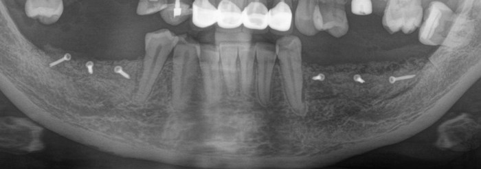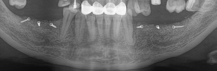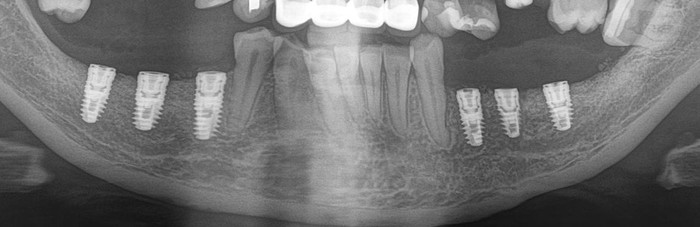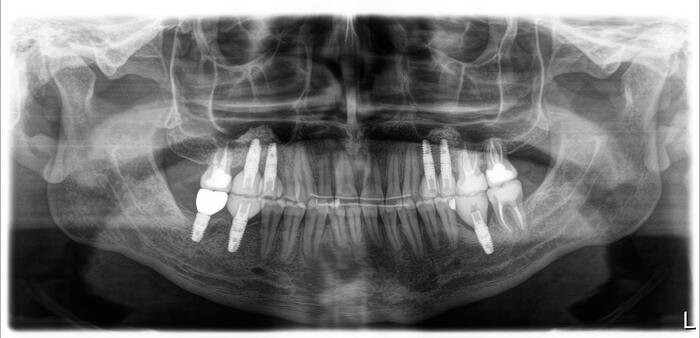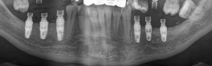 Дабы не перегружать вас обилием одинаковых картинок, я оставлю один рентгеновский снимок, но отмечу, что установка имплантатов на верхней и нижней челюсти проводилась с разницей в 10 дней.