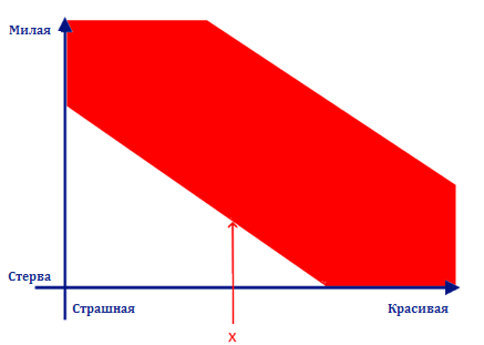 Чтобы проиллюстрировать его, возьмём стереотип, будто красивые женщины всегда стервы. Стереотип родился, разумеется, не на пустом месте, а из «жизненных наблюдений». Чтобы доказать, что это всего лишь стереотип, построим график, где по горизонтальной оси будем отмечать степень привлекательности: от очень страшной до божественной красоты, а по вертикальной – характер: от милашки до стервы. Давайте будем честны, мы согласимся встречаться с женщиной только, если выполнится условие: