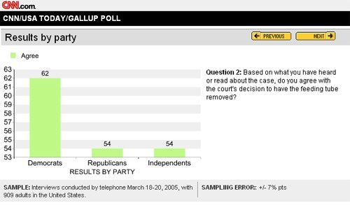 Чтобы не быть голословным, приведу пример, где подобная инфографика буквально решала вопросы жизни и смерти – дело Терри Шайво. Вкратце, женщина находилась в больнице в вегетативном состоянии, и решался вопрос об её отключении от системы жизнеобеспечения. Родители же были против и прибегли к апелляции к общественному мнению, что впоследствии привело к серьёзным политическим дебатам в отношении вопроса о принудительном отключении подобных больных от системы питания. История довольно драматичная, но нам интересен результат опроса, проведённый CNN, а так же форма представления результатов: