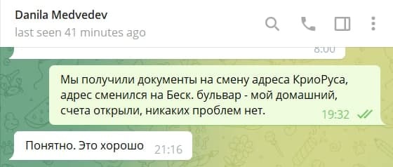 Доводим до сведения СМИ, что инициатором ложной информации является гражданин РФ Данила Андреевич Медведев, обладающий 4,74 % в компании "КриоРус" (ИНН 7721554738) и злоупотребляющий своим правом в пользу созданной им в июне 2021 года компании. В настоящее время решается вопрос о привлечении данного гражданина к уголовной ответственности за попытку хищения имущества компании и клевету. Данный гражданин будет в ближайшее время исключен из состава учредителей за злоупотребление своим правом учредителя из компании Криорус.