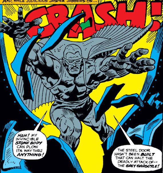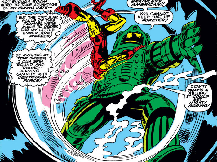 Но появление серой громадины пугает людей ничуть не меньше, чем бушующие крупные кошки! Всё же, успокоив кошек несмертельным ударом током и вновь переодевшись, Тони выслушивает восторжённый щебет своей девушки, Мэрион. “Железный Человек – современный рыцарь в сверкающих доспехах! Ну, пока что в мрачных и страшных, но ведь они могут быть и сияющими!”. Так что в домашней лаборатории Тони красит костюм в золотой цвет. И вскоре до Тони доходят новости: жители окружили небольшой городок стеной, никого не впускают, не выпускают. Сделав подкоп под стеной, ЖелЧел видит, что народ ему, такому золотому, не рад. Люди паникуют – “Гаргантус велел никого не пускать! Гаргантус похвалит нас, если мы избавимся от Железного Человека!”. И все в городе поклоняются исполинской статуе неандертальца. Ну, Тони решает эту проблему “в лоб” – с помощью миниатюрного, но мощного громкоговорителя на транзисторах, орёт Гаргантусу “ПвП или зассал!”, предварительно разломав статую. И Гаргантус появляется! И Тони сразу понимает – никакой это не неандерталец. Железный Человек бросает в Гаргантуса три магнита, предварительно прокачав их цилиндрическими транзисторами (всё это хранится у него на поясе в кармашках а-ля Бэтмэн), и те разрывают Гаргантуса (который оказался роботом) на клочки! Инопланетяне, которые спустили на город Гаргантуса, впадают в панику и удирают в своём звездолёте в пердя космоса. А с жителей города спадает навеенный Гаргантусом гипноз. Победа!