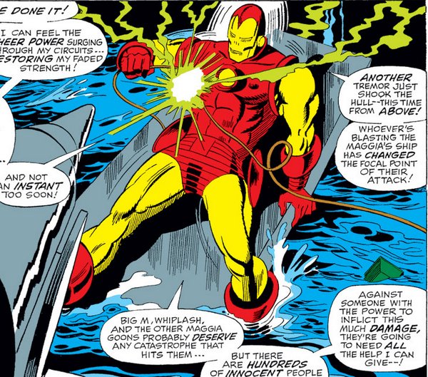 Тони и Иньсен вдвоём создают бронированный железный нагрудник, оснащённый кучей микротранзисторов – он не подпустит шрапнель к сердцу Тони. А где нагрудник, там и рукава, штаны, перчатки, сапоги и шлем. Увы, без потерь не обходится – люди Вон-Чу убивают Иньсена. И Тони не может его спасти – костюм в это время заряжается. Но как только транзисторы оказываются полностью заряжены, Железный Человек оживает! Да, несколько минут уходят на то, чтобы научиться ходить в этой неуклюжей громадине, но транзисторы позволяют управлять бронёй с помощью мозговых волн, так что вскоре Тони осваивается. Поначалу прилипнув к потолку, чтобы спрятаться от преследователей, Железный Человек решает, что вечно прятаться не получится, и вызывает Вон-Чу на дуэль. “Теперь тебе противостоит не раненый, умирающий человек, и не добренький старик-учёный, а Железный Человек!”. Используя магнит на обратной тяге и цилиндрический транзистор, Тони создаёт силу, позволяющую отбивать пули! А с помощью другого транзистора взламывает систему громкоговорителей и убеждает прихвостней Вон-Чу дезертировать и бежать. Сам Вон-Чу тоже бежит, роняя кал. Тони уничтожает его склад боеприпасов и удаляется, сетуя, что теперь обречён носить нагрудник, не снимая никогда.