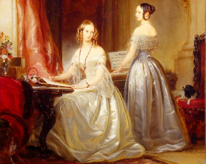 Ольга Николаевна в возрасте 20 лет (слева, сидит) и Александра Николаевна в возрасте 17 лет (справа, стоит)