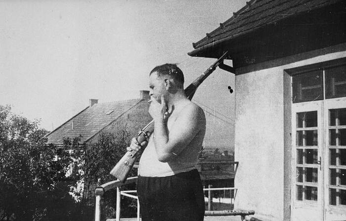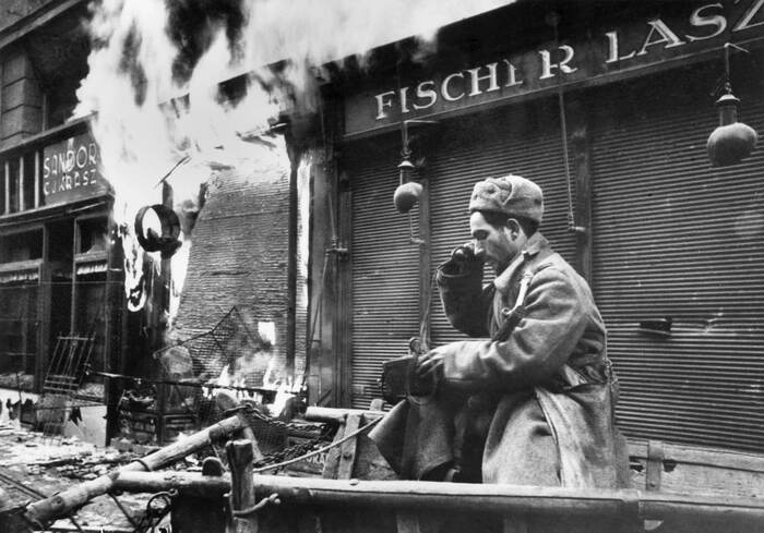 20. Расчет советской 203-мм гаубицы Б-4 под командованием старшего сержанта С. Шпинь на окраине Данцига (ныне — Гданьск, Польша) ведет огонь по немецким войскам в городе. Март-апрель 1945 года, Германия.