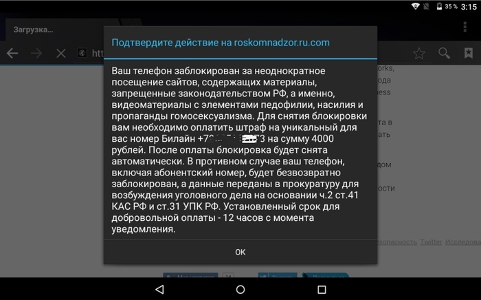 Ваш телефон заблокирован за неоднократное посещение сайтов, содержащих материалы, запрещенные законодательством РФ, а именно, видеоматериалы с элементами педофилии, насилия и пропаганды гомосексуализма. Для снятия блокировки вам необходимо оплатить штраф на уникальный для вас номер Билайн +7^ 23 на сумму 4000 рублей. После оплаты блокировка будет снята автоматически. В противном случае ваш телефон, включая абонентский номер, будет безвозвратно заблокирован, а данные переданы в прокуратуру для возбуждения уголовного дела на основании ч.2 ст.41 КАС РФ и ст.31 УПК РФ. Установленный срок для добровольной оплаты 12 часов с момента уведомления.