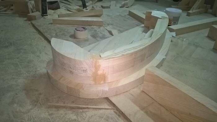 Ну самый наверное простой - это склеить здоровенную заготовку и вырезать подступенники , метод подсмотрел у более старших товарищей и он мне не особо нравился, так как простой в теории - этот способ муторный и трудоемкий на практике, но зато массив получался очень крепким и неубиваемым. На фото ниже пример из 3х сегментов, делал и одним сплошным сегментом, но не найду сейчас фотографии.