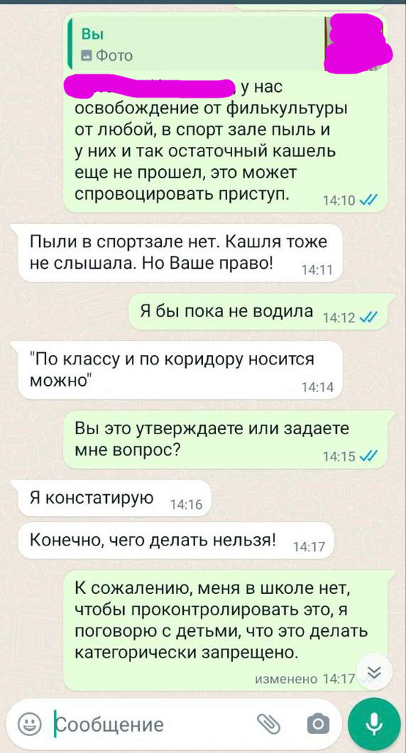 Если вкратце: детей повели на физру и отругали, что без формы. Мама пишет, что у них освобождение. Потом какой-то неловкий спор, дальше мама блокирует учителя — это я уже не буду показывать, и так понятно, к чему все идет.