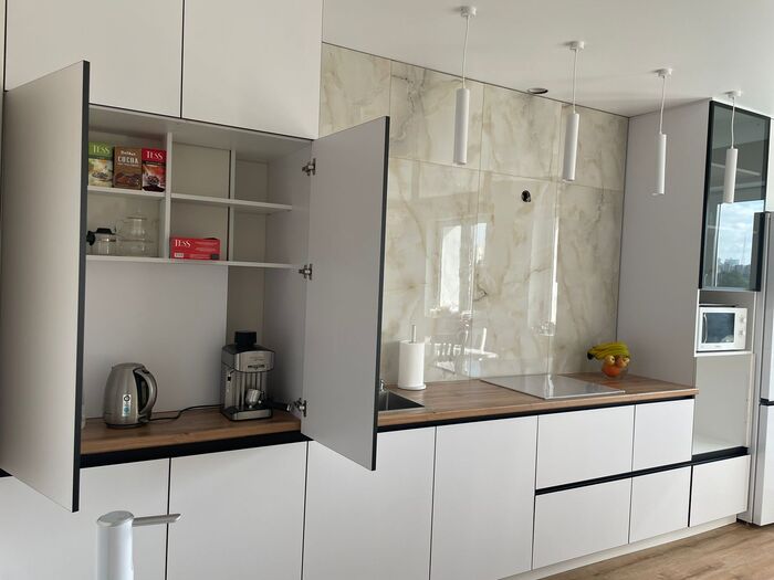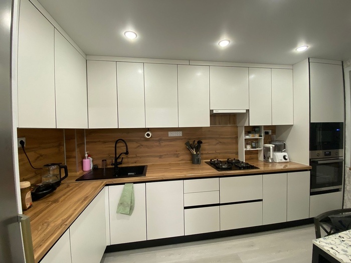 2. Вторая причина - со стороны ЛДСП как фасад, выглядит хорошо, особенно, когда используешь скрытые профиль-ручки. Глухие фасады без фрезеровки и без ручек - это минимализм. И это эстетично и современно. Лично я не сторонник моды, но я ценю, когда перед глазами не мельтешат мелкие детали и разнообразие цветов. Но это уже дело вкуса, каждому своё)