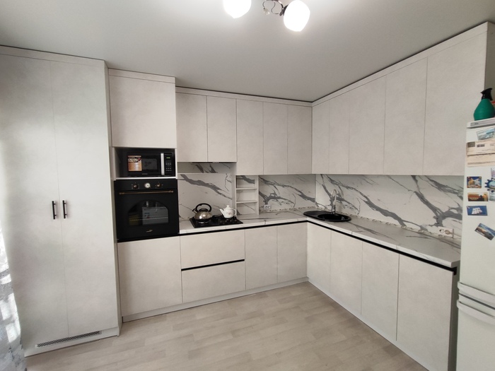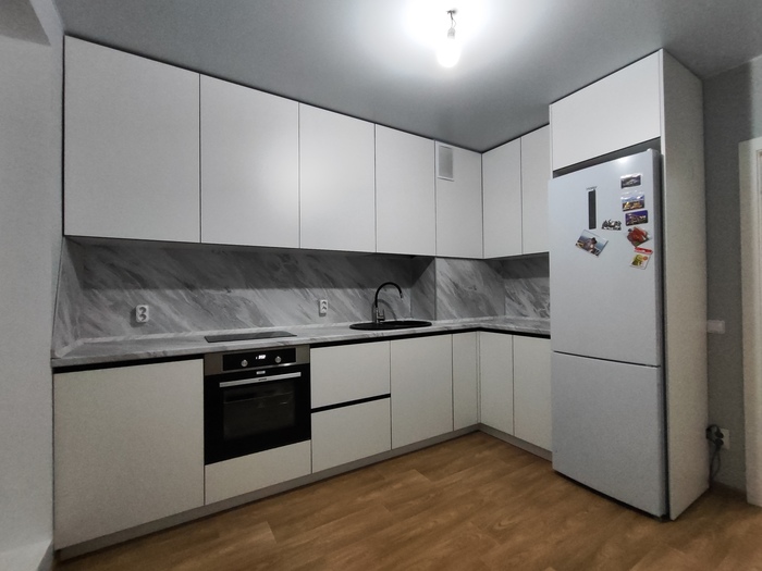 Лирическое отступление... На ЖК Сосны, что в сторону Алексеевки, у меня был объект, я ставил там прихожку. У клиентов уже была установлена кухня с фасадами в МДФ эмали. Там горизонт профиль ручки не был соблюден должным образом - переход от нижних шкафов к пеналу с духовкой был со ступенькой (см. четвертое фото).