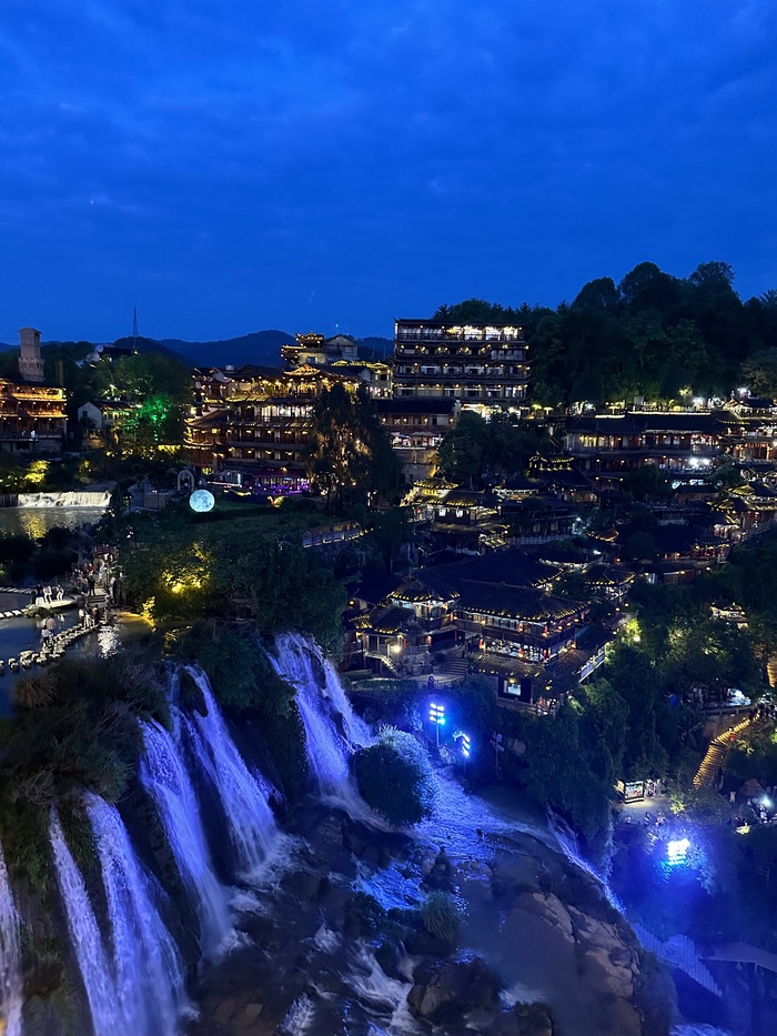 Водопад очень живописный, ночью у него меняющаяся подсветка, которая сочетается с оранжевыми фонариками, развешанными всюду на скалах.