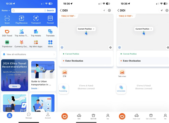 Вот как выглядит перевод. Например, я выбираю Didi приложение в Алипей. Это такси.
