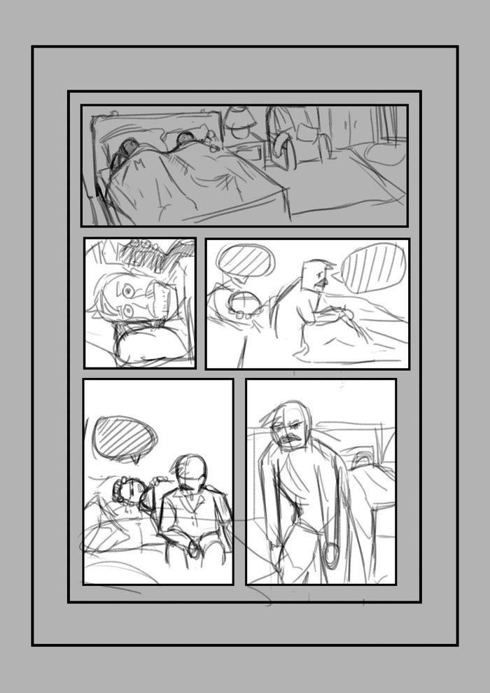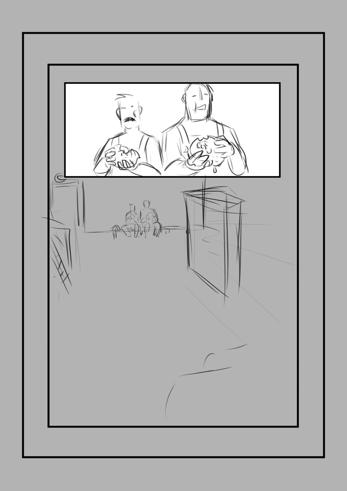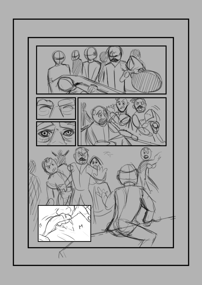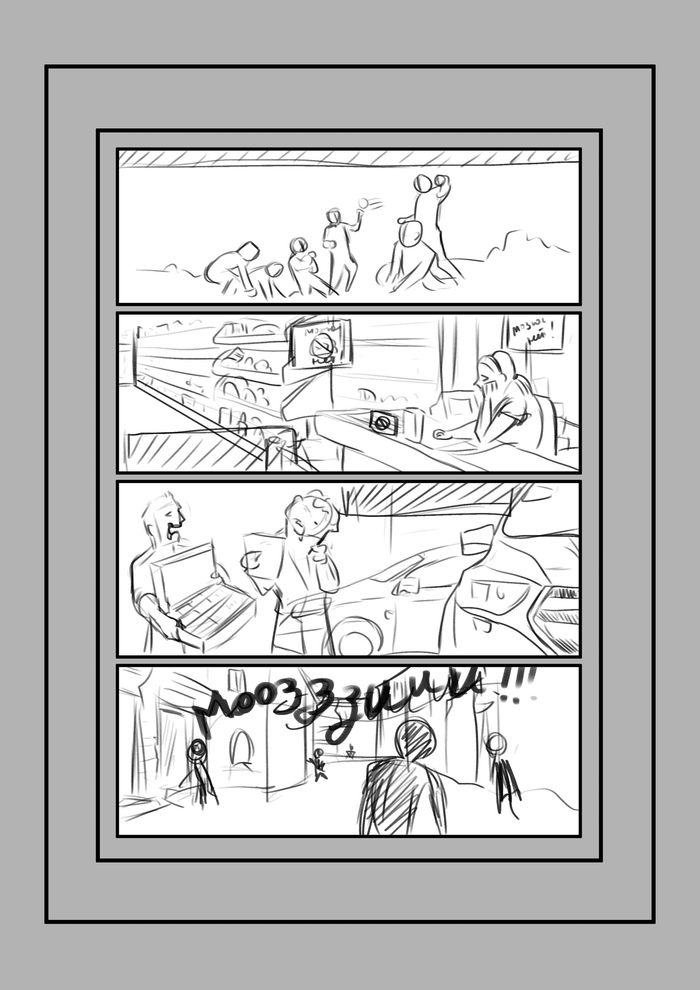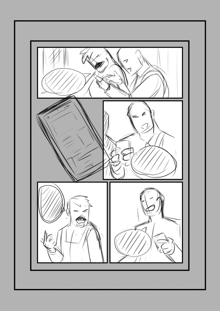 Следующий этап - скетчи. Что такое скетч? Это упрощенное изображение, чтобы определиться с ракурсом, позами героев и т.д. Чтобы, если что-то пойдет не так, не перерисовывать страницу, на которую ушла масса усилий, а прорабатывать комикс в грубом черновике.