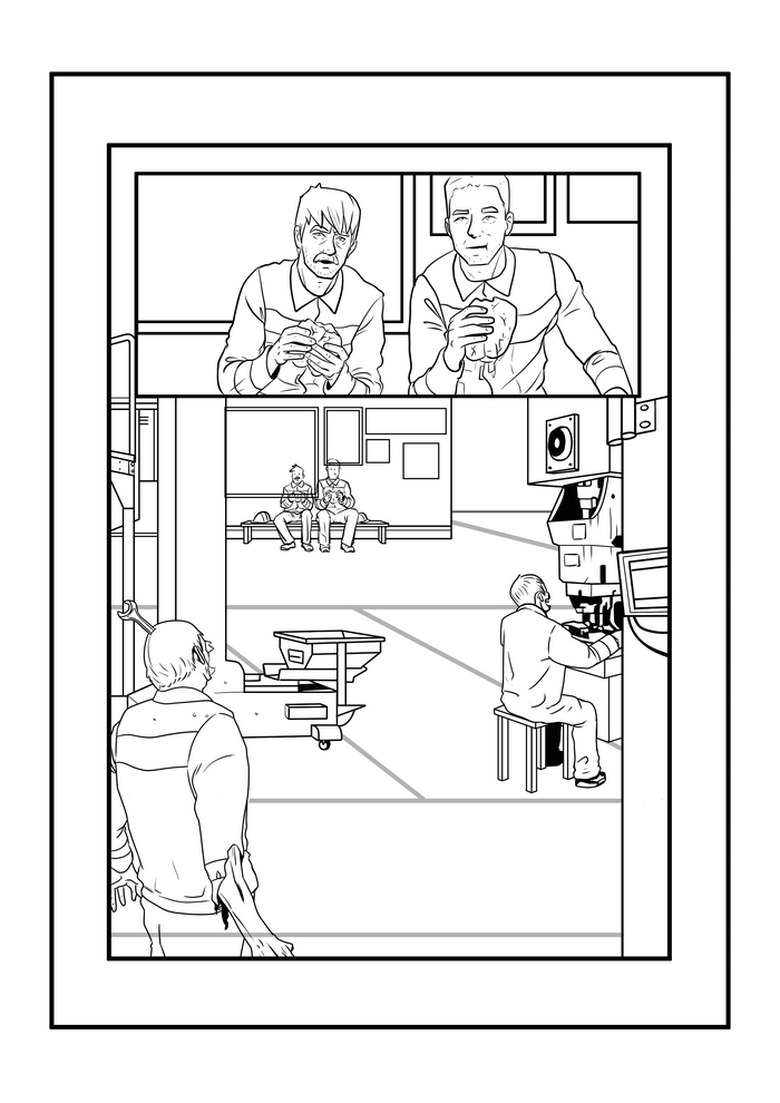 Продолжается работа по комиксу по рассказу "Мозги...", до конца осталось совсем немного, уже готов черно-белый вариант в линиях: