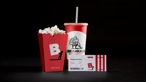 Дизайн-студия оформила стаканы, билеты и емкость для попкорна — все в красном цвете с маскотом.