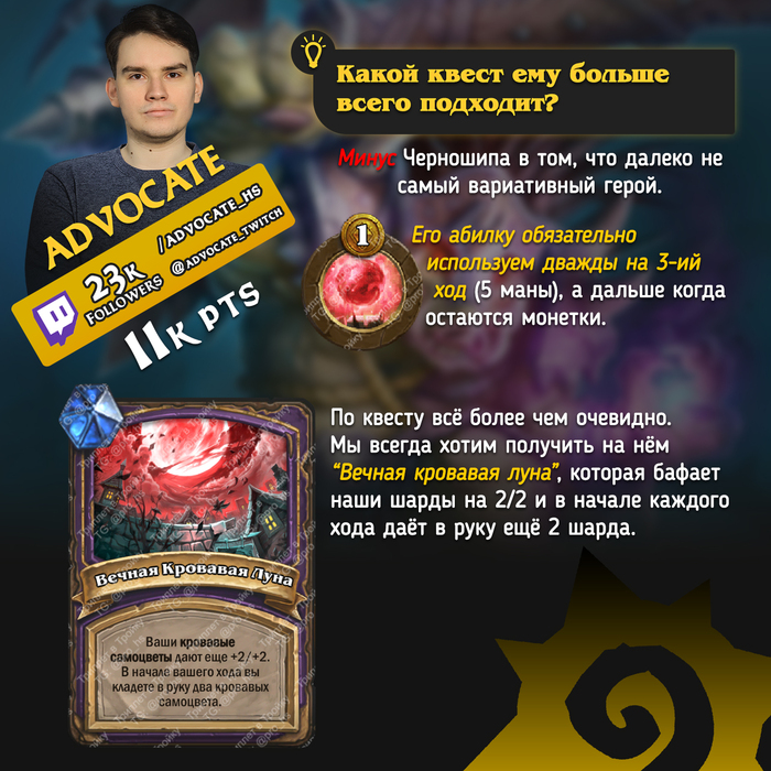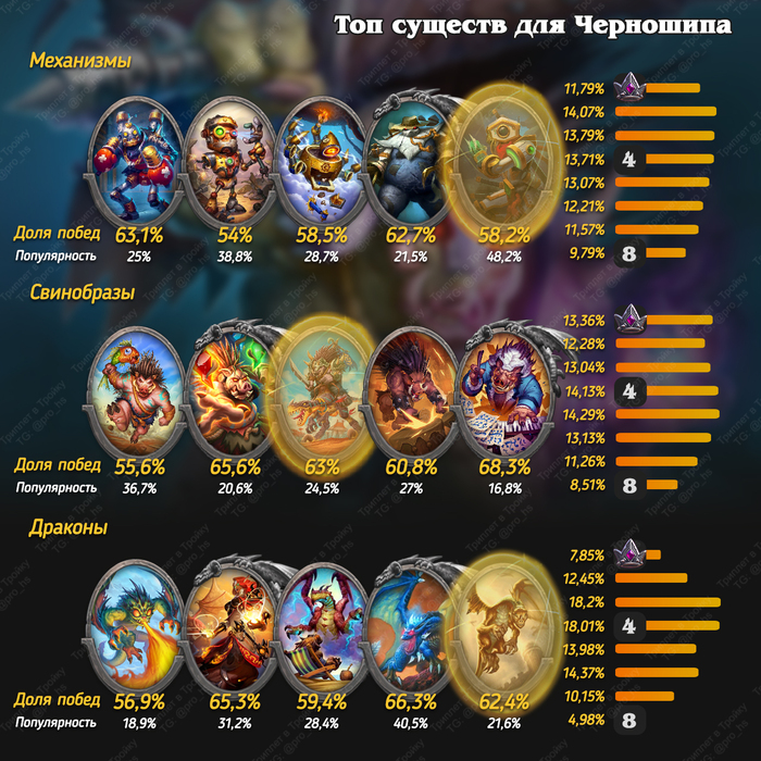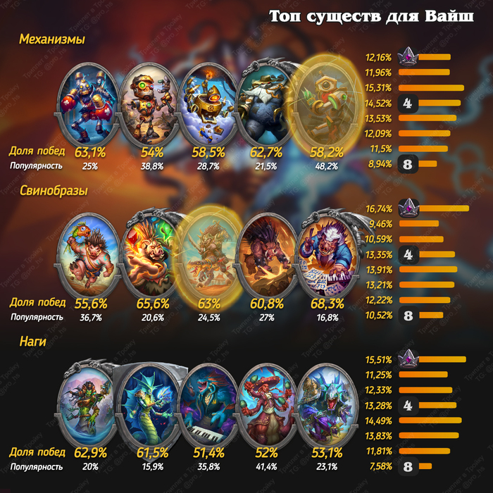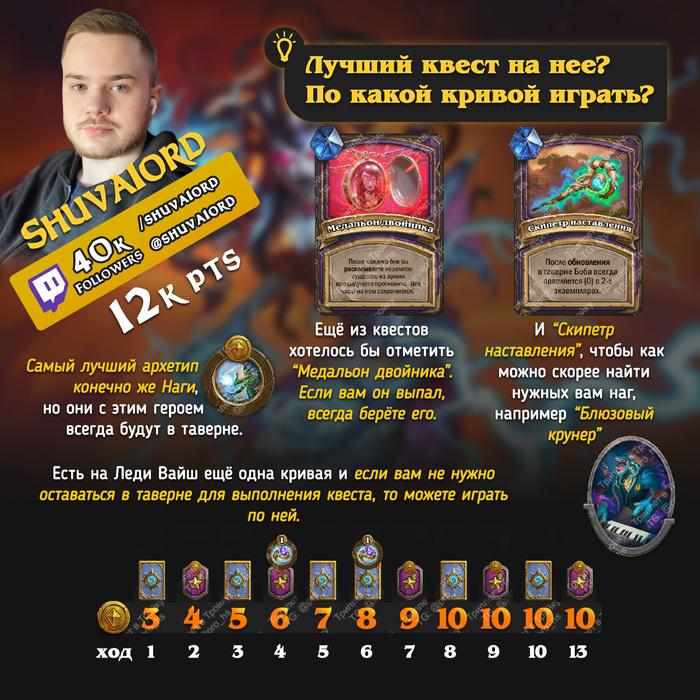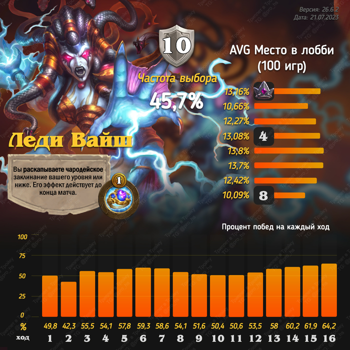 Относительно рандомный и не самый простой герой для игры. Вам очень сильно должно везти с картами в таверне, чтобы дожить до поздней игры и получать прокаченные карты с погибших врагов.