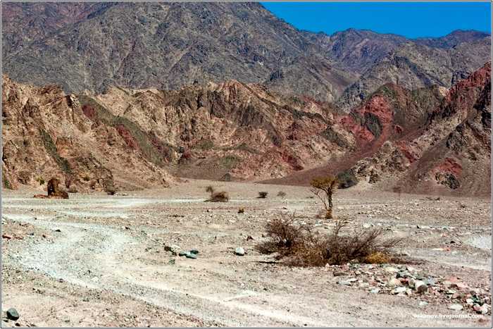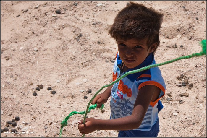 По дороге мы остановились на блокпосте, и Ахмед что-то вручил стоящему там кочевнику. На наш вопрос, что это было, он объяснил, что правительство хочет искоренить кочевой образ жизни бедуинов и привлекает их к работе и участию в жизни страны. Поэтому все туристские фирмы обязаны брать на работу бедуина в качестве проводника. За одну экскурсию проводник получает шестьдесят долларов. Однако проще заплатить ему шестьдесят долларов и оставить на блокпосте, чем брать с собой, ибо ни английского, ни русского языка эти бедуины не знают и рассказывать о достопримечательностях не желают. А место в машине занимают. И если бы мы решили всё-таки взять его собой, то пришлось бы урезать наши припасы.