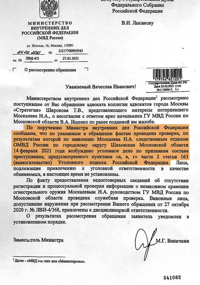 О данных нарушениях мной было сообщено в жалобе в Генеральную прокуратуру, а также поставлен вопрос о внесении надзорного представления на вынесенный приговор. Жалоба была направлена для рассмотрения в Прокуратуру Московской области. Однако, жалоба была рассмотрена формально, ее ответы не соответствуют имевшим место обстоятельствам и не соответствуют требованиям закона, более того, большая часть доводов была проигнорирована и не получила ответов. Соответственно, в данной части жалоба даже формально не рассмотрена. По ряду вопросов ответ содержит дезинформацию, как, например, в том, что у Москалева Н.А отсутствуют лица, находящихся на иждивении.