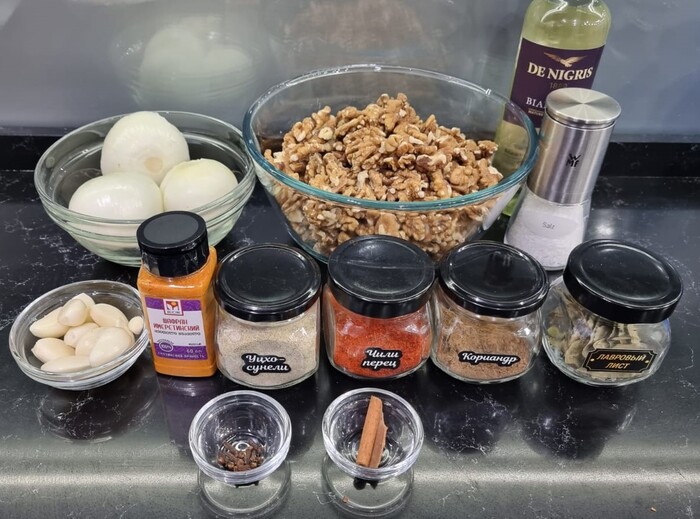 2. Грецкие орехи. 700 грамм. Зураб брал на полтора кг курицы, 500 грамм орехов.