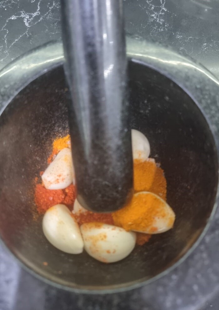 По совету Зураба кладём чайную ложку соли, чеснок, пол чайной ложки перца и чайную ложку имеретинского шафрана в ступку и толчём. Изрядно намучившись я вам так делать не советую. Чеснок выдавите чеснокодавкой, а потом растолките в ступке! Геморроя в разы меньше, а результат тот же. Чесночная паста.