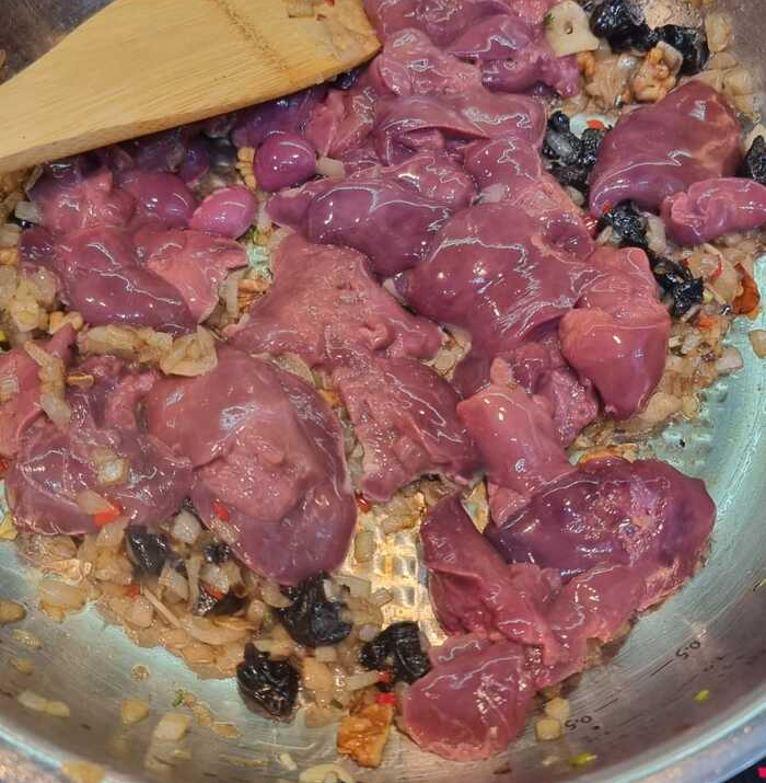 Процесс подходит к концу. Берём кастрюлю. Выкладываем первую часть орехов, с которой выдавливали "жидкое золото", сверху кладём вторую часть со специями и луком. Подливаем бульон.