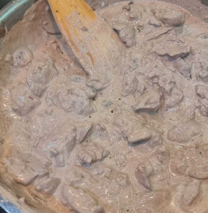 Перебиваем блендером и опять подливаем бульон. У меня так прошло 6 циклов и ушёл почти весь бульон. Получилась консистенция очень жидкой сметаны. На этом этапе солим. чуть солоновато должно получится. Помним что курицу сильно не солили. Добавляем уксус. И кладём куски обжаренной курицы.
