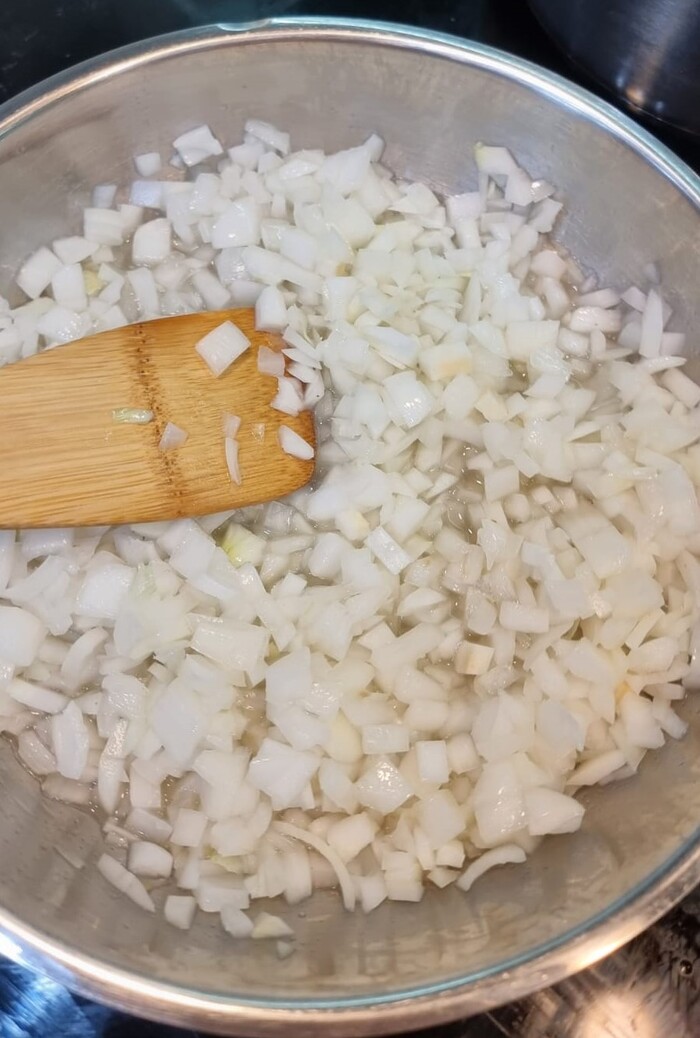 Режем мелким кубиком лук. Выкладываем лук в сковороду и наливаем черпак бульона. Желательно собрать жир с поверхности бульона. Тушим лук до прозрачности, постепенно подливая бульон по мере выпаривания.