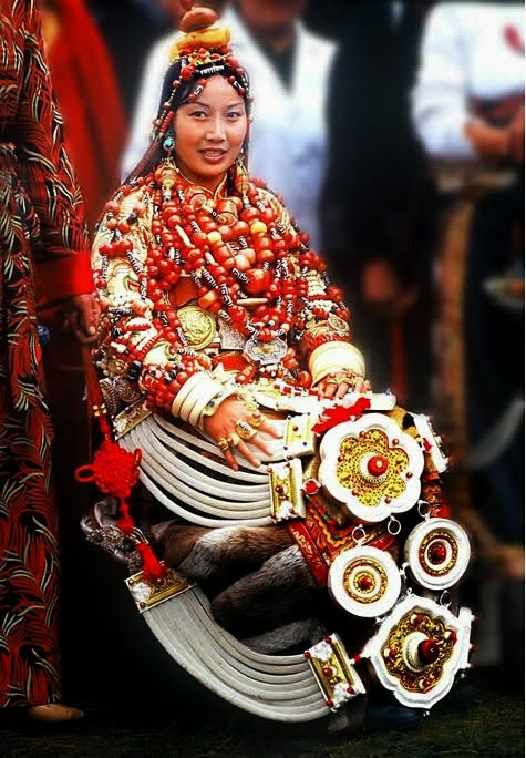 Такие костюмы носят жительницы Тибета, появляясь в людных местах во время ярмарок, каких-либо праздничных или религиозных церемоний.