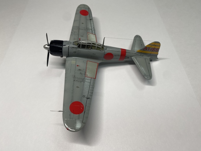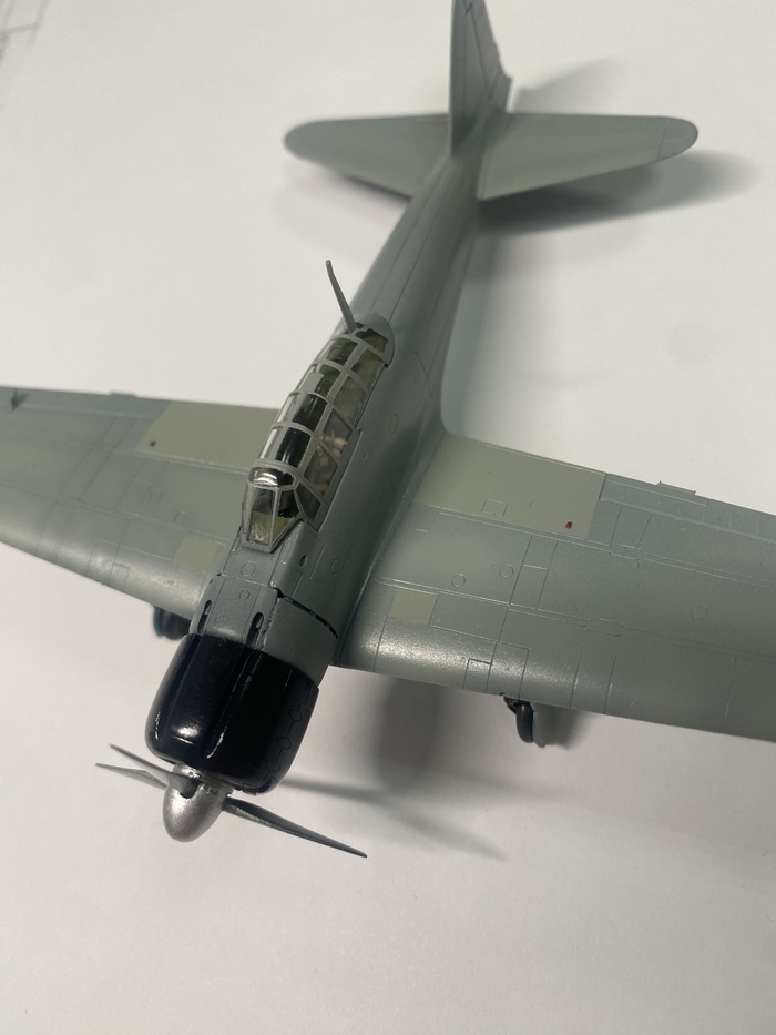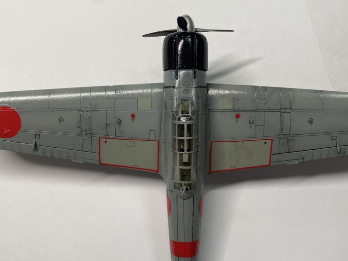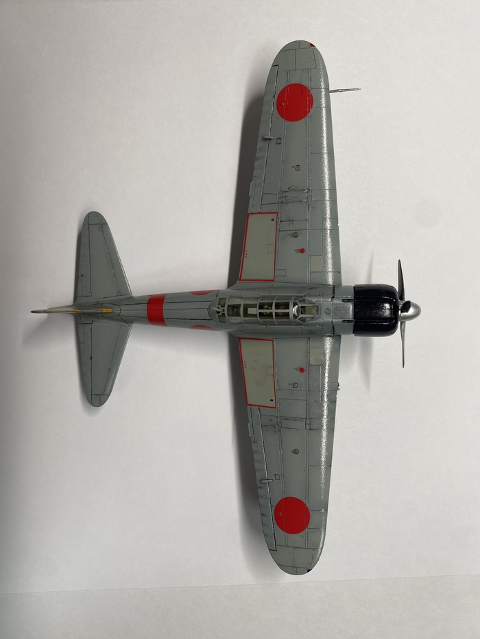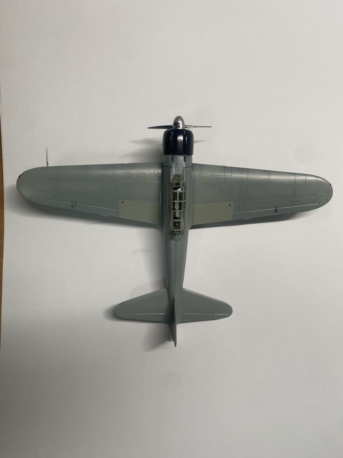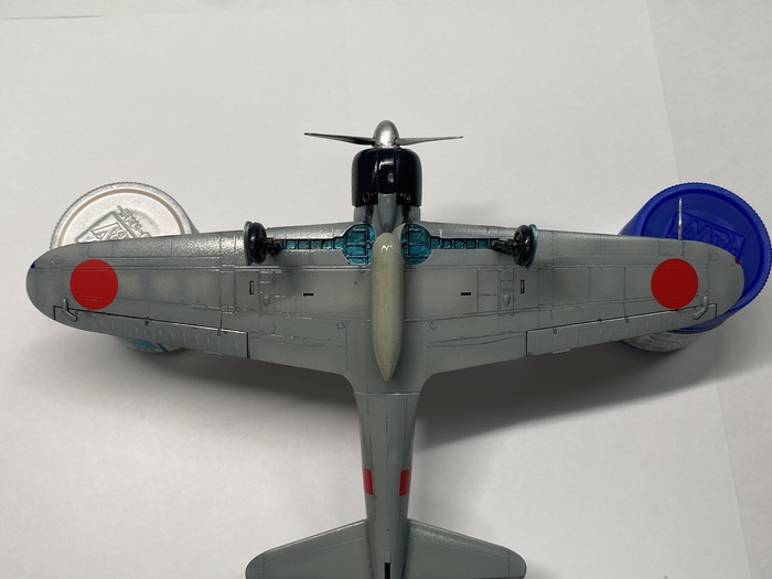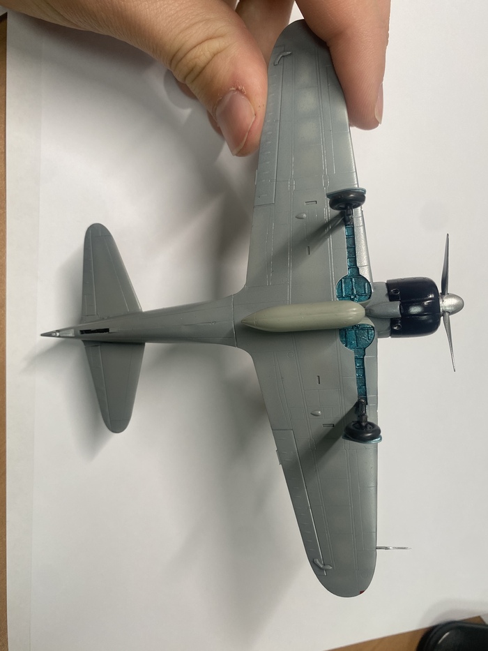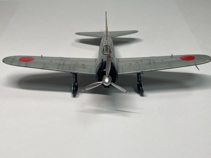 Во время сборки из-за корявых рук клей попал на хвостовой оперение, поэтому пришлось шлифовать. Следы сия действа можете наблюдать. Поражает размах крыльев, если сравнивать с Ki-43 и Ki-44, а ведь это, в том числе, самолет авианесущего флота, где, мне думается, компактность решает.