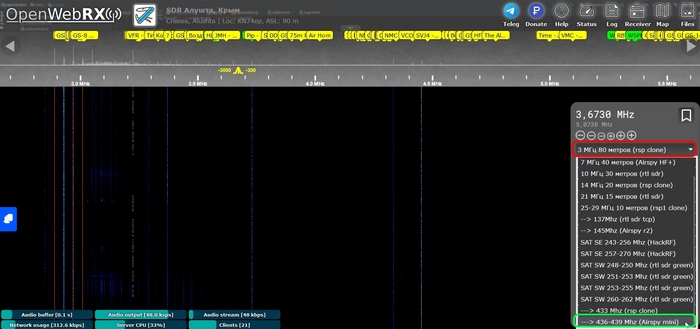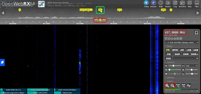 На улице шёл сильный дождь, поэтому я ловил сигнал на частоте 145.800 МГц при помощи сервиса Web-SDR rikmotik.ru, расположенного в Алуште примерно в 230 километрах от моего дома.