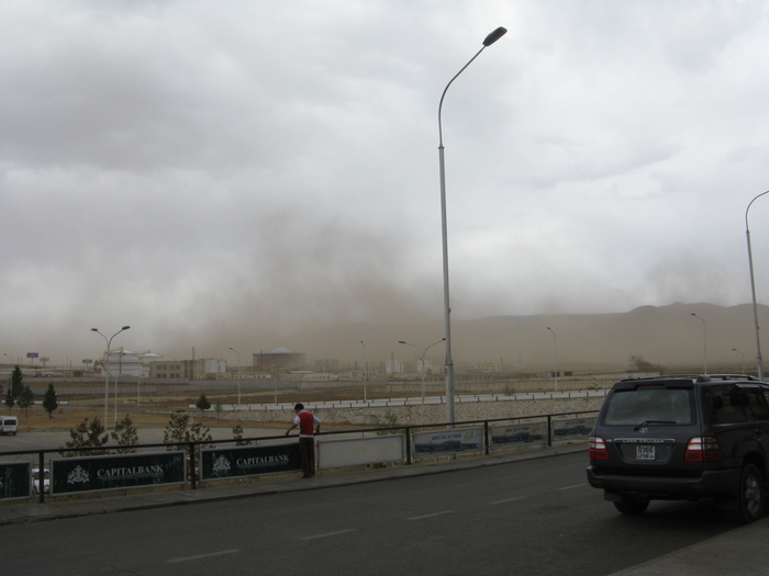 Мельчайшая, дисперсная пыль, несомая горячим ветром. Вздохнуть невозможно, глаза сразу забиваются пылью. Полёты отменяются, все самолёты остаются до завтра на земле. „Приходите завтра, на сегодня приём окончен. Идите нахуй с миром. Кто ночует в аэропорту на полу получит в качестве приза стакан воды. “ – всё, что могли сказать на стойке регистрации. Нам вызвали такси. Минут через 15, обмотав голову тряпками из чемоданов как заправские моджахеды, мы выползли наружу, влезли в такси и помчались обратно в гостиницу.