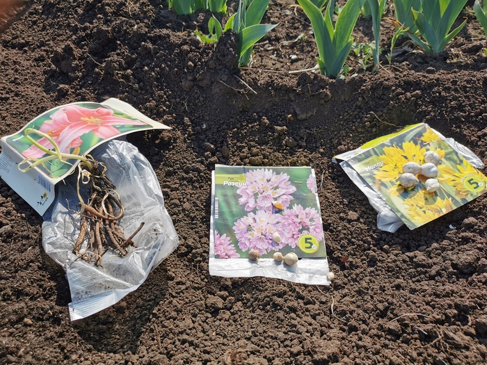 Привёз часть своих гладиолусов и много купленных георгин, один лилейник, 25 луковиц чего-то и цветущий лук две пачки.