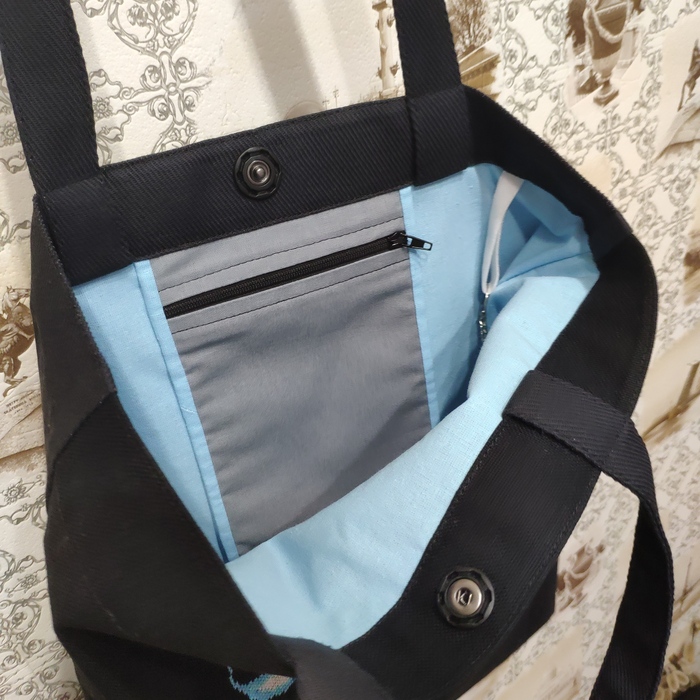 Процесс пошива не снимала. Это моя первая такая большая сумка, но выкройки там одни прямоугольники, размеры брала со своего старого магазинного шоппера. Ткани все хлопок: канва Линда, диагональка, бязь; вышивка укреплена флизелином.