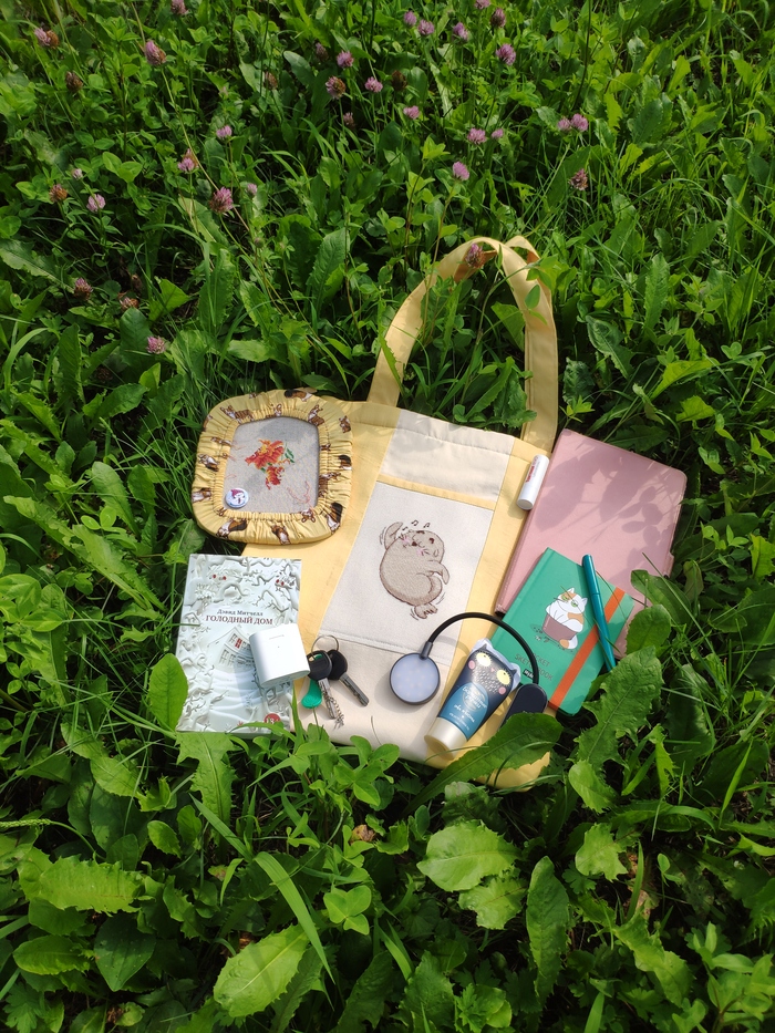 Сумка в пошиве простая, но для меня довольно важная по двум причинам. Во-первых, вышивка на ней – это моя разработка по одному из стикеров для телеги, которые я рисовала год-два назад. Надеюсь, я все же подопну себя дорисовать полноценный стикерпак (просто так, для собственного удовлетворения) и сделаю из него серию схем (опять же с той же целью).