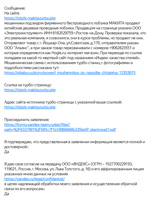 Писал ранее пост: «Проверил мошенников по наводке читателя». Если коротко, мошенники на базе сервиса Яндекс «Турбо-страница» turbo.site создают одностраничник с продажей одного товара, в моем случае на странице https://lobzik-makita.turbo.site/ был беспроводной лобзик Макита, а присылали китайский лобзик «Победа» с проводом (хорошо, что не кирпич).