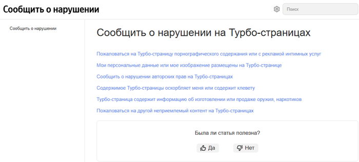 На данных Турбо-страницах снизу есть ссылка «Пожаловаться», при ее нажатии попадаем на страницу «Сообщить о нарушении на Турбо-страницах»