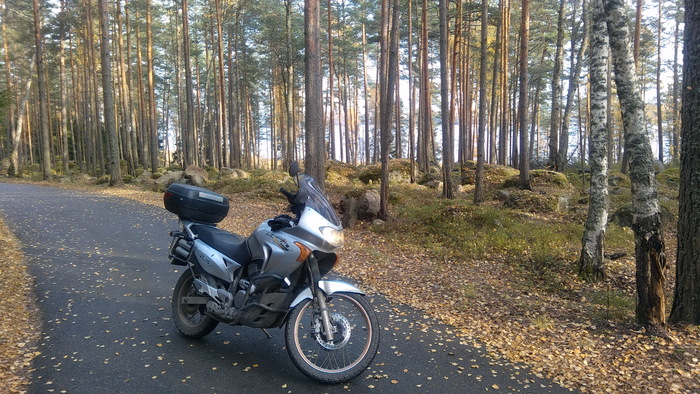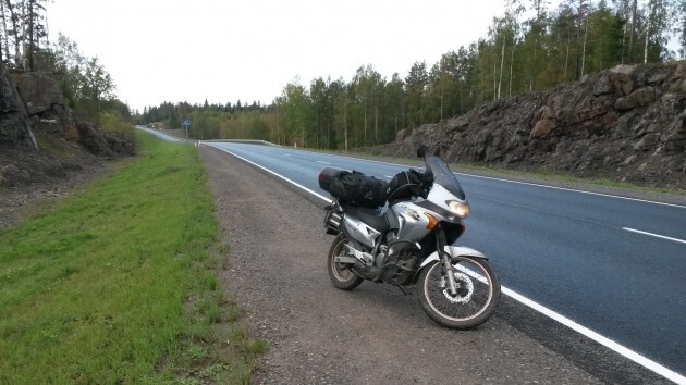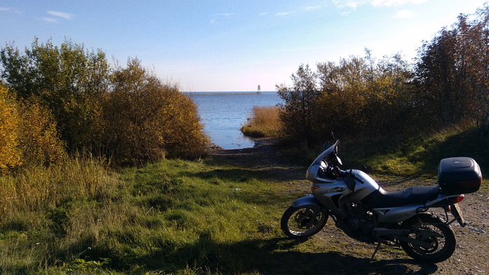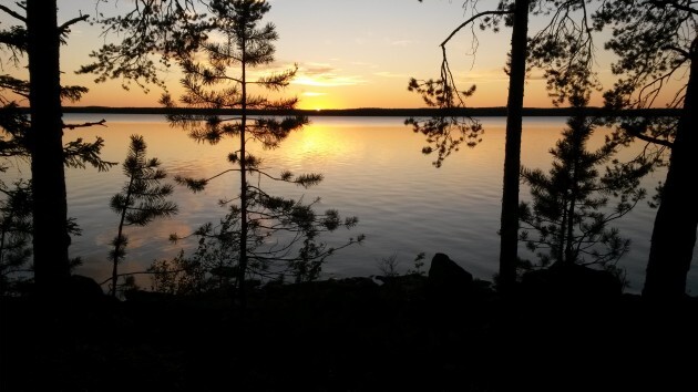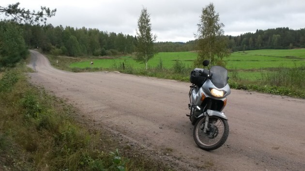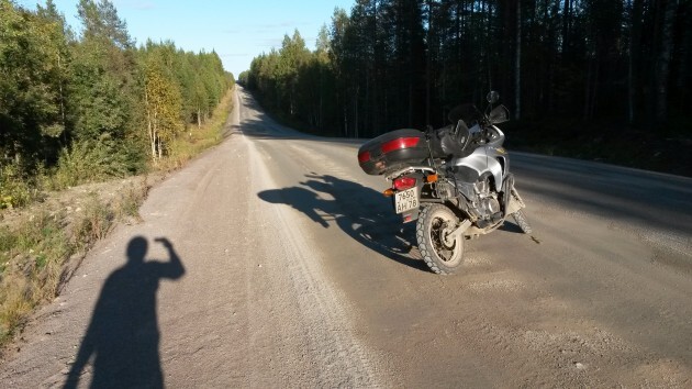 Заправляясь у поворота на Питкяранта, я очень надеюсь, что за оставшиеся два часа до заката мне доведётся проехать 80 километров до места ночлега по приличной дороге. Я надеюсь на асфальт, но моим надеждам не суждено оправдаться – едва свернув по указателю, я выезжаю на грунтовку. Потом мне рассказали, как мне повезло; в сухие дни эта грунтовка покрыта толстым слоем пыли, на которой скользко, ничего не видно и нечем дышать, а в сезон дождей её размывает и снова скользко, но теперь уже очень грязно. А я попал в золотую середину – за день до моего приезда прошёл умеренный дождь, дорога была чистой и гладкой, и, подгоняемый солнцем в спину, я делаю этот участок чуть более чем за час. Очень ярко помню, как взлетая на очередной подъём на скорости близкой к ста я думал лишь об одном: «Только бы не лось…». Но сейчас всё уже позади, я сижу среди сосен на берегу озера, на горелке греется банка с тушёнкой, а прямо передо мной солнце ложится спать на той стороне воды.